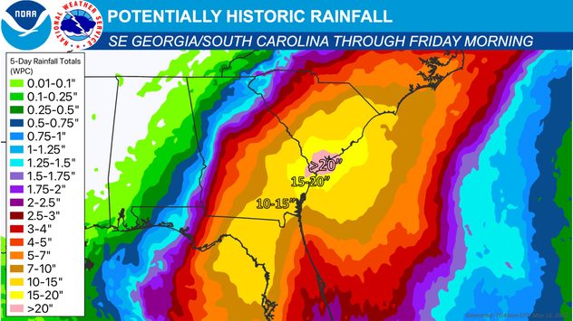 El giro hacia el noreste y el este traerá problemas importantes y prolongados en una gran parte del sureste. Debby se arrastrará entre el lunes y el miércoles, viajando apenas 250 millas en esos dos días. Se pronostican lluvias históricas para Carolina del Sur y el este de Georgia. Las precipitaciones podrían superar los 30 pulgadas en algunos lugares. Para Florida, es posible que haya una franja de lluvia de entre 8 y 12 pulgadas a lo largo de la I-10 desde Tallahassee hasta Jacksonville.
