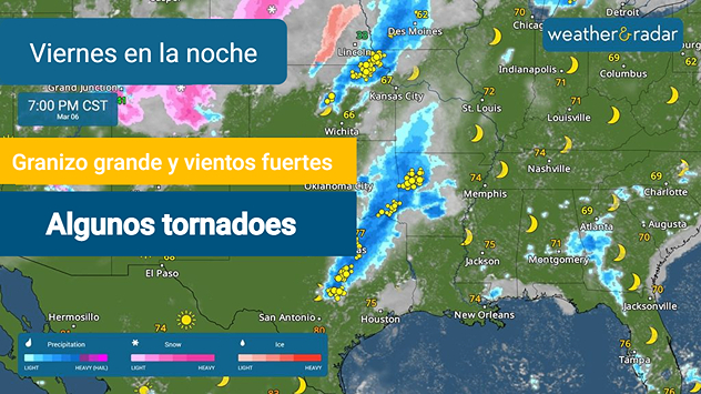 Esta tarde, esta noche y hasta mañana por la mañana se esperan fuertes tormentas en las llanuras y en algunas zonas del Medio Oeste. Es posible que se produzcan granizo de gran tamaño, vientos intensos y tornados.