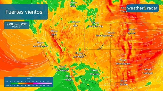 Además de los problemas causados por las fuertes lluvias, que provocan inundaciones locales y posibles deslizamientos de tierra en las zonas recientemente quemadas, el Radar de Viento muestra que se avecinan vientos fuertes con el sistema de tormentas. Las ráfagas de más de 30 mph serán habituales en el sur y el centro de California, con ráfagas aún más fuertes, de más de 50 mph, en los puertos de montaña y en las zonas más elevadas.