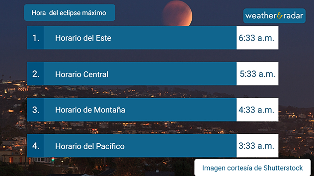 Consulte el Radar del Tiempo para conocer las condiciones meteorológicas antes de salir. Además, le recomendamos que consulte las horas de salida del sol y de la luna en nuestra función astrológica, especialmente si se encuentra en la costa este. Las ciudades de la costa este pueden disfrutar de un espectáculo poco común llamado selenelion, en el que se puede ver brevemente el sol al salir y la luna totalmente eclipsada al ponerse, en horizontes opuestos.