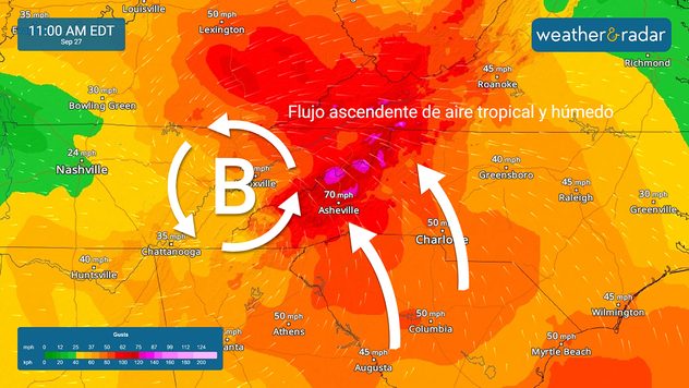 A medida que Helene avanza tierra adentro, el flujo de humedad tropical del sureste llegará a las laderas orientales de los Apalaches del sur. Se producirá un levantamiento orográfico, cuando una masa de aire cálido y húmedo se eleva sobre montañas o colinas, lo que permitirá que se acumulen las lluvias más intensas de la semana.