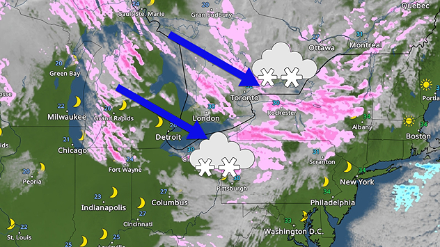 El viento frío del noroeste recoge humedad sobre los Grandes Lagos. Esto provoca la formación de intensas nevadas, visibles desde el radar del tiempo.
