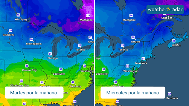El Radar de Temperaturas muestra que las temperaturas del martes por la mañana oscilarán entre 13 y 20 grados en la franja norte y el Alto Medio Oeste, hasta el valle del Ohio, con temperaturas que alcanzarán los 20, 30 y 40 grados en todo el noreste y la costa atlántica central. Muchos se abrigarán bien ante estas bajas temperaturas, que pueden descender hasta 15 grados por debajo de la media.