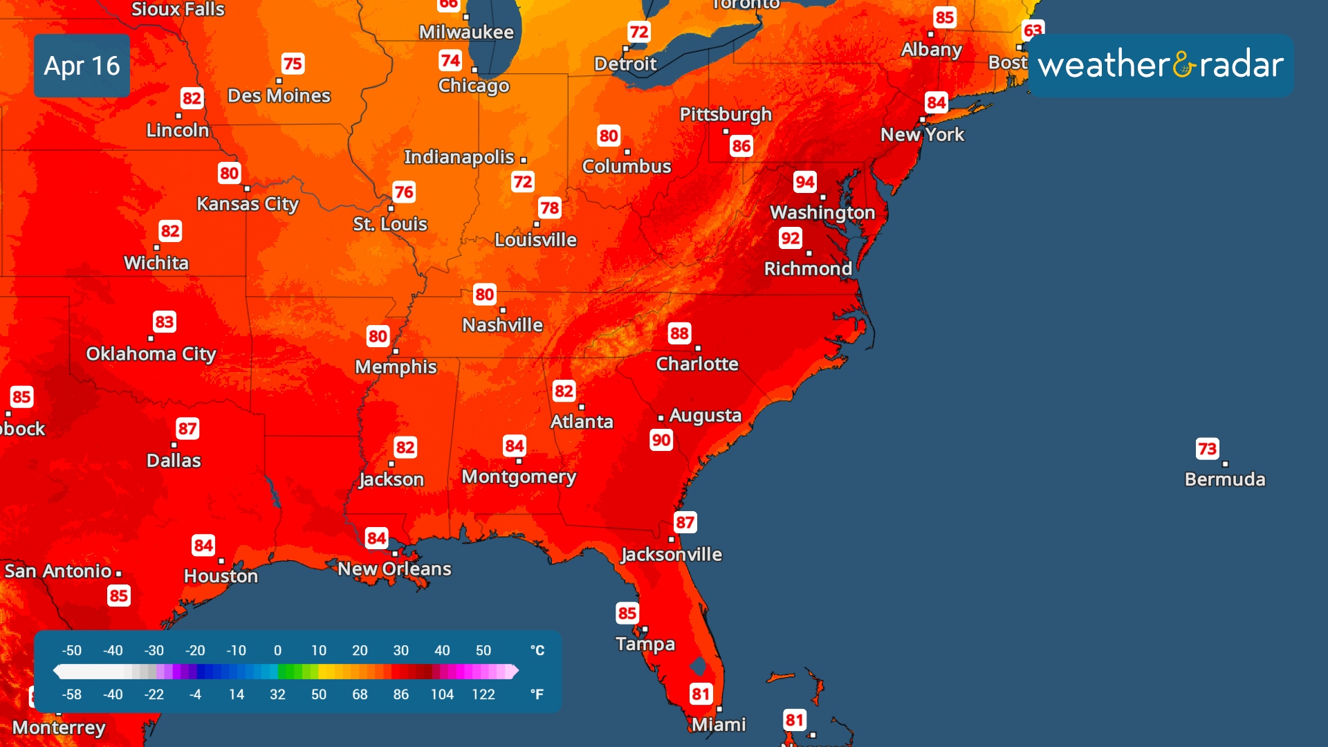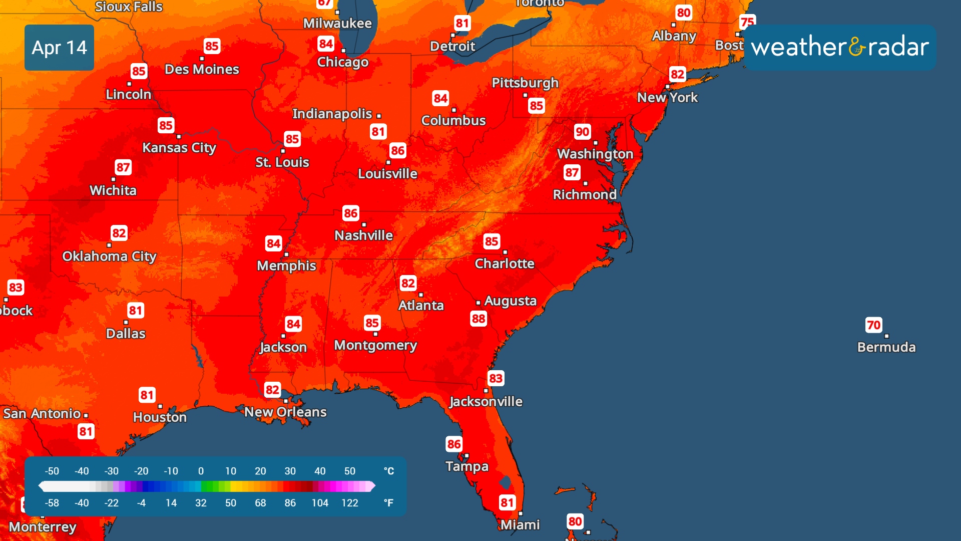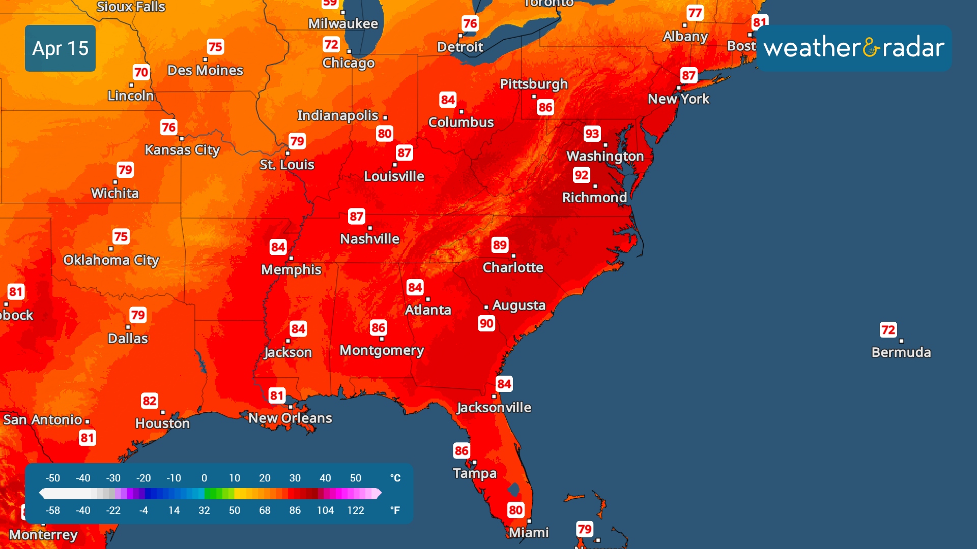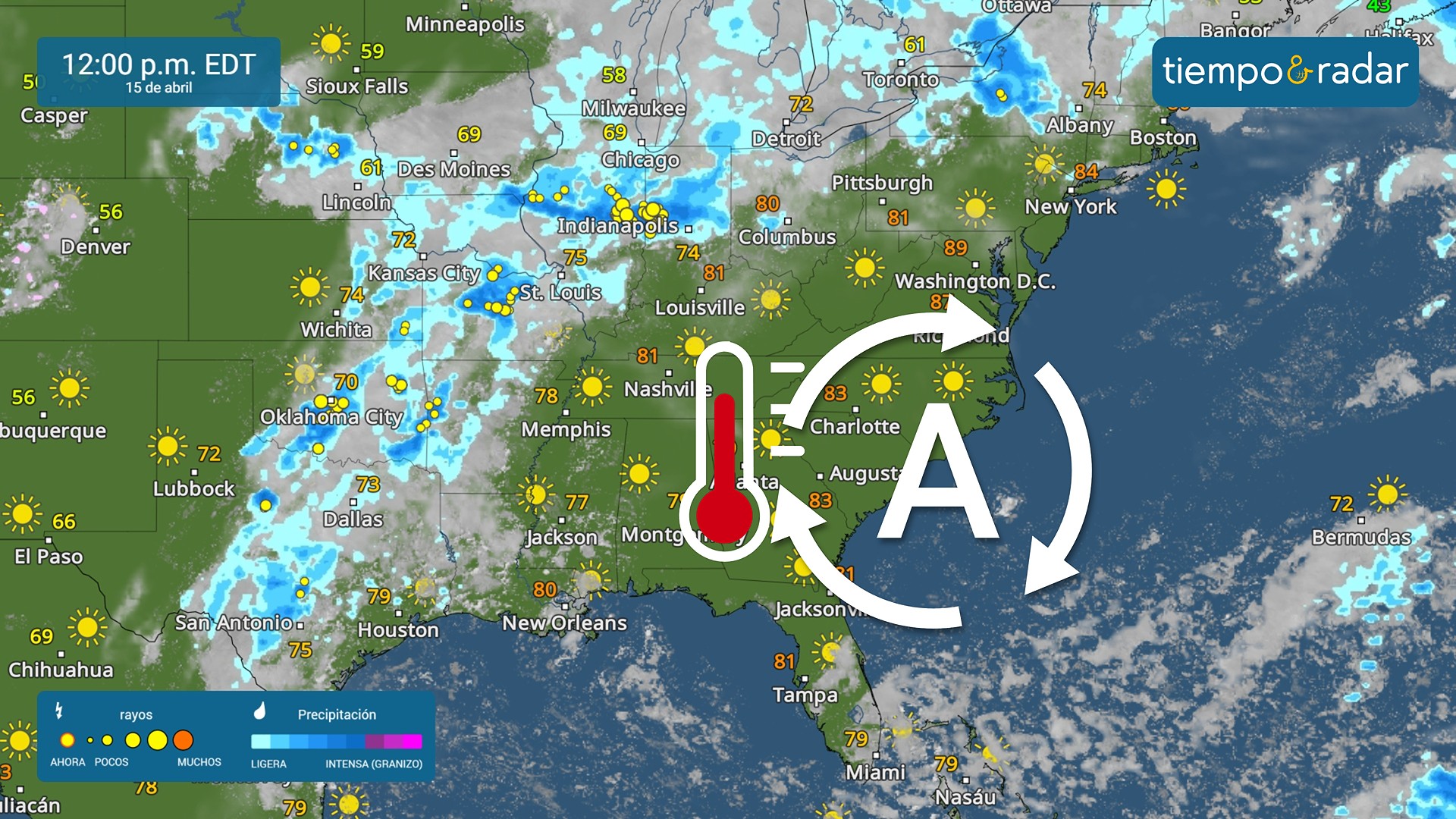 ¿Hasta qué punto subirá la temperatura? Las máximas se situarán entre 20 y 30 grados por encima de la media habitual para mediados de abril, al menos hasta finales de semana, y se podrían batir decenas de récords. El calor será especialmente intenso en algunas zonas de la región del Atlántico Central. Esta semana podrían registrarse máximas históricas en ciudades como Atlanta, Washington D. C., Filadelfia, Charlotte (Carolina del Norte) y Nashville (Tennessee).