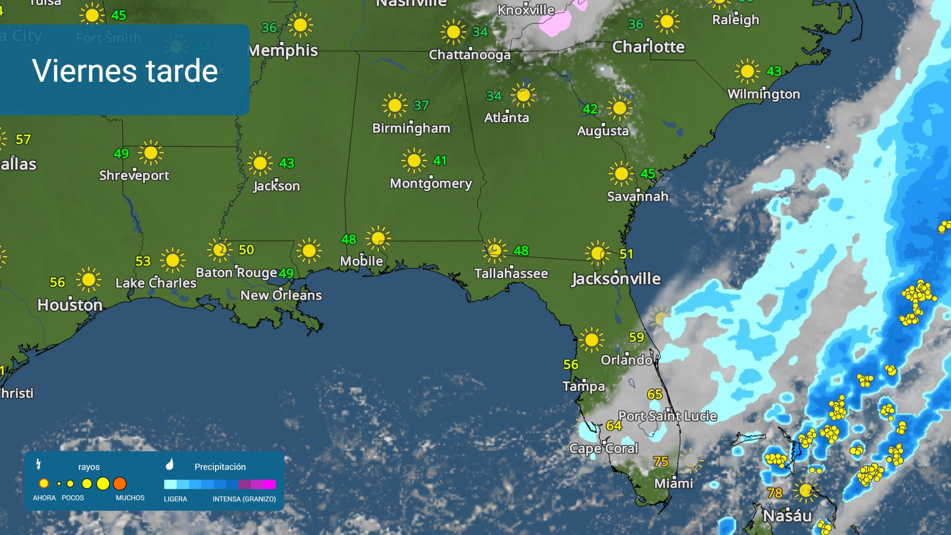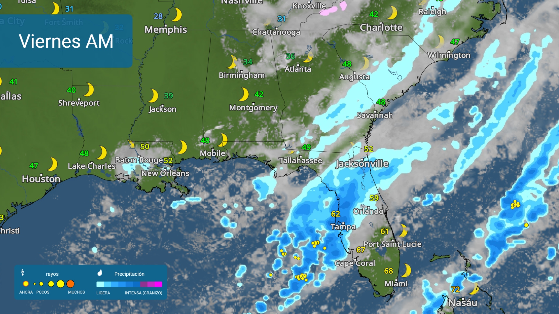 En cuanto a las precipitaciones, estas se mantendrán por delante del frente. Es posible que caigan algunos copitos de nieve en porciones del sureste de Georgia, como en Savannah y en partes del centro de Carolina del Sur, pero es más probable que nieve llegue a esta misma zona para el domingo, con la llegada del próximo frente frío y porque ya tendríamos aire frío en dominio. Las lluvias impactarán el norte, centro y sur de Florida durante el jueves, comenzando en la mañana para el norte y saliendo sobre el sur de Florida para el comienzo de la noche. No esperamos grandes cantidades de lluvia, pero lo que caiga será bienvenido ya que el estado continúa bajo una sequía peligrosa.