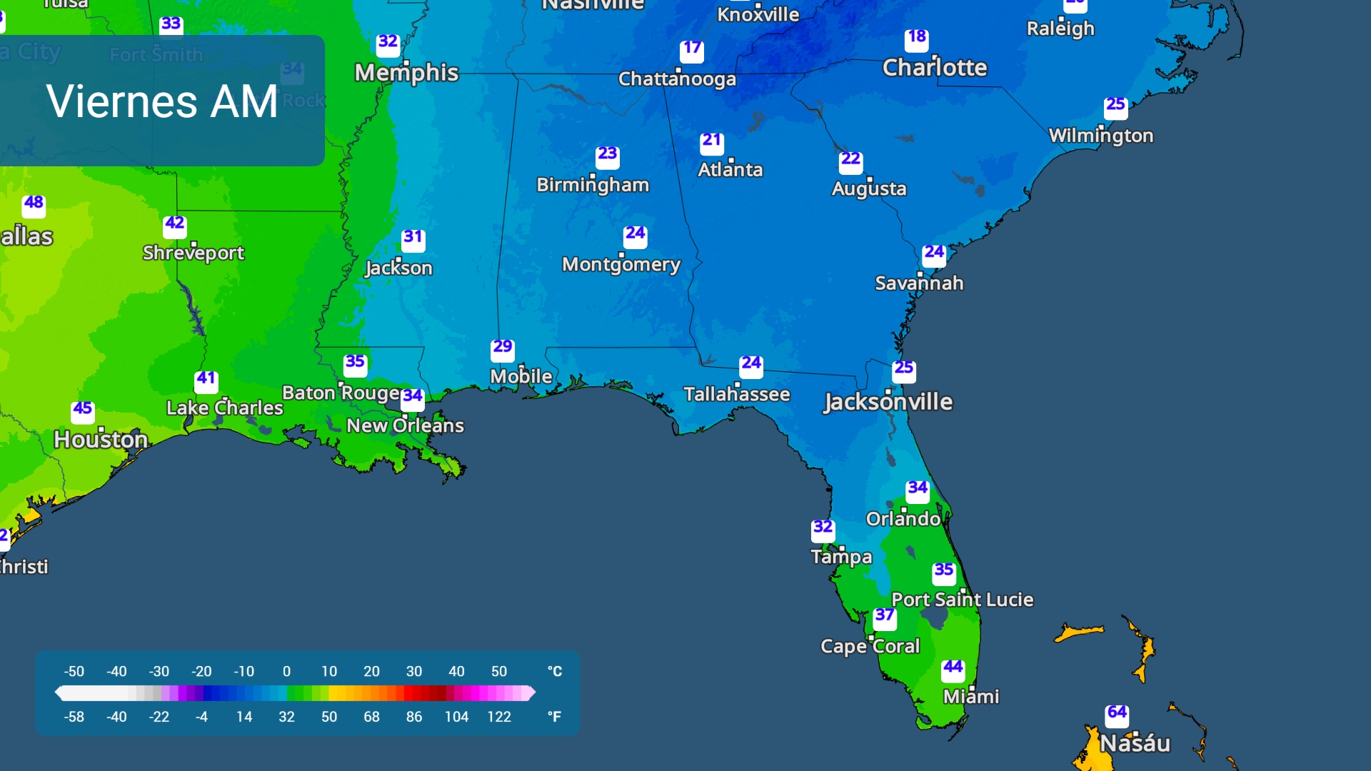 Las temperaturas caerán para terminar la semana en el sur y el este de los EE.UU., debido a una masa de aire polar que traerá frío y, con el viento, las temperaturas se sentirán gélidas.