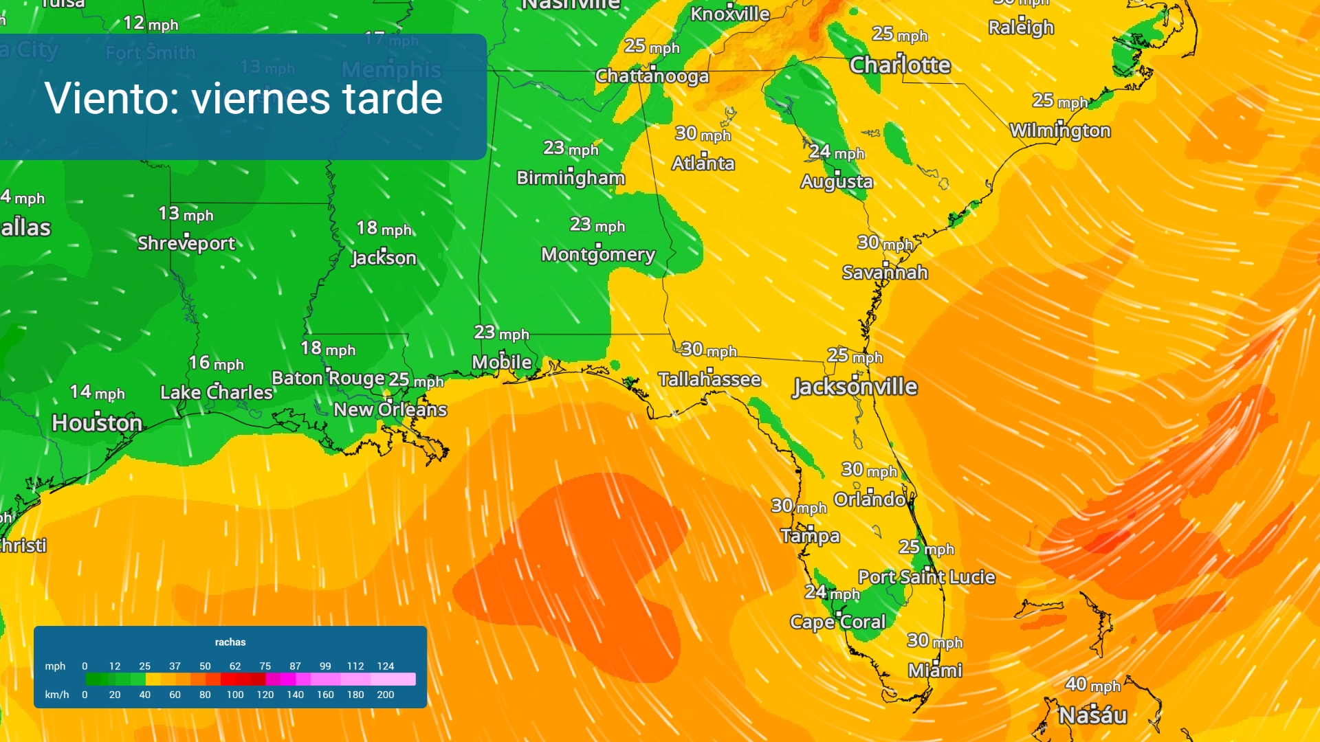 Un frente frío se desplazará sobre el sureste y el este del país el jueves, lo que abrirá las puertas al frío. Esta masa de aire frío será histórica para varias ciudades del sureste. Ciudades como Miami, donde las temperaturas podrían caer al rango bajo de los 40, podrían vivir lo más frío en 3 años. Sí, de paso, le sumamos el viento; las temperaturas se sentirán mucho más frías de lo que marque el mercurio. Rafagas de viento superiores a 20 mph harán que las temperaturas en el norte de Florida, Georgia y las Carolinas se sientan como si estuviesen entre 12 y 18 grados F. Mientras que Florida Central se pondrá a sentir como si estuviese en el rango medio de los 20 grados F el viernes por la mañana.