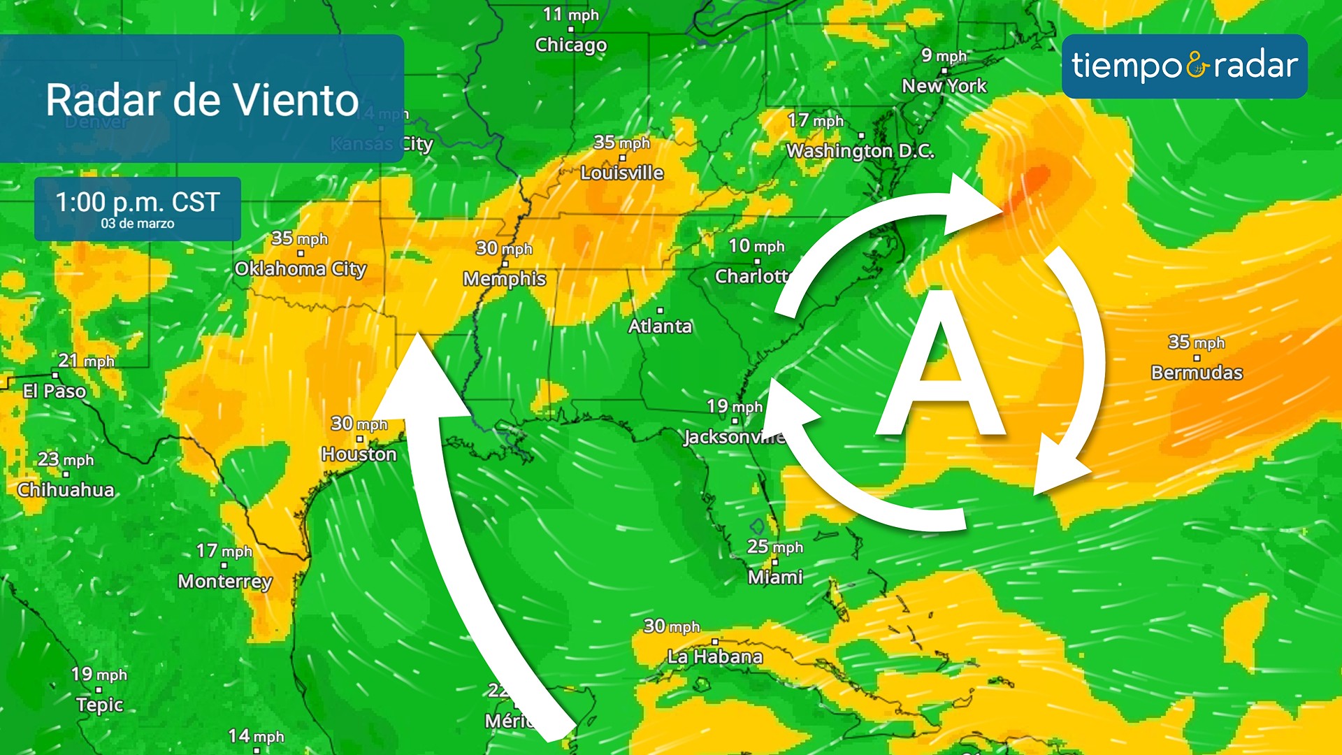 El motivo del tiempo tormentoso de esta semana es la formación de una zona de alta presión sobre el sureste. Como muestra el Radar de Viento, los vientos fuertes del sureste traerán una masa de aire húmedo desde el golfo hacia el norte, hasta las llanuras del sur y la parte baja del valle del Mississippi.