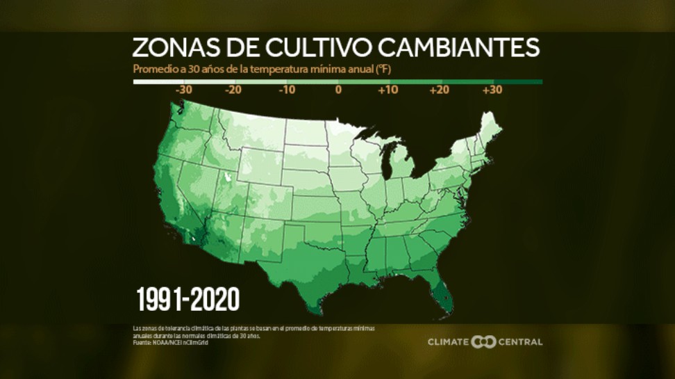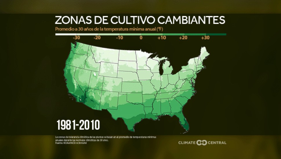 Las zonas de cultivo se están desplazando hacia el norte en los EE. UU.Las zonas de cultivo se basan en temperaturas mínimas normales anuales, y el invierno calentó más entre los períodos de la normal 1981-2010 y 1991-2020.Los mapas para los tres períodos normales más recientes muestran que las zonas de tolerancia climática de las plantas se desplazan hacia el norte a medida que se calienta la época más fría del año.Cortesía: Climate Central