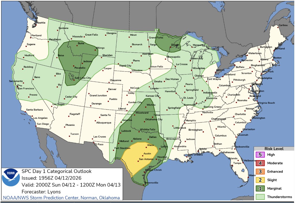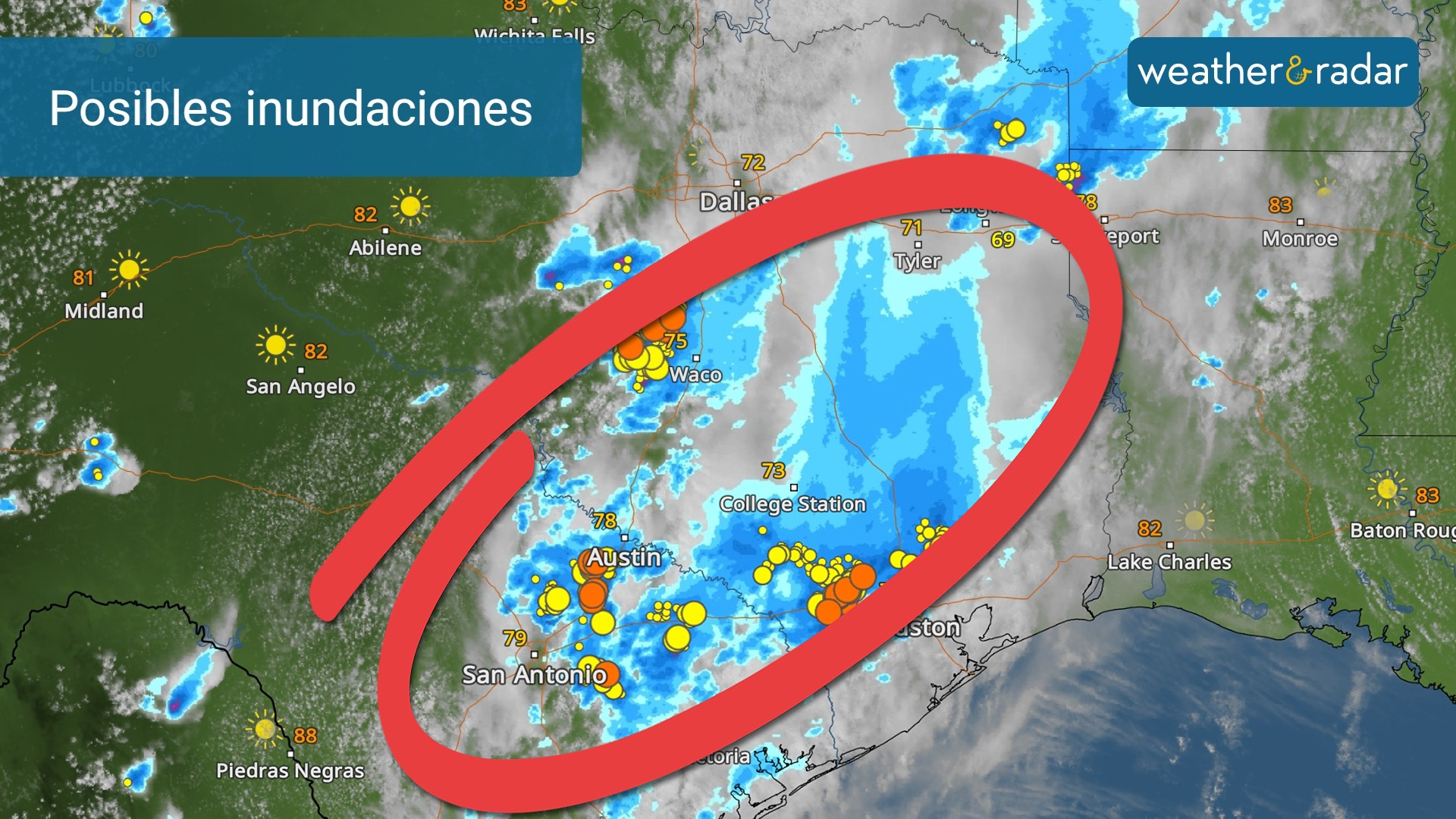 Mientras que Texas tendrá riesgo de que algunas tormentas produzcan granizo, vientos destructivos y un par de tornados hasta horas de la noche. También, dado que el suelo está bastante saturado por las lluvias de ayer y por los montones de agua que caen hoy, es posible que se produzcan algunas inundaciones repentinas en San Antonio, Austin, Waco, College Station, Houston y zonas aledañas a estas ciudades.