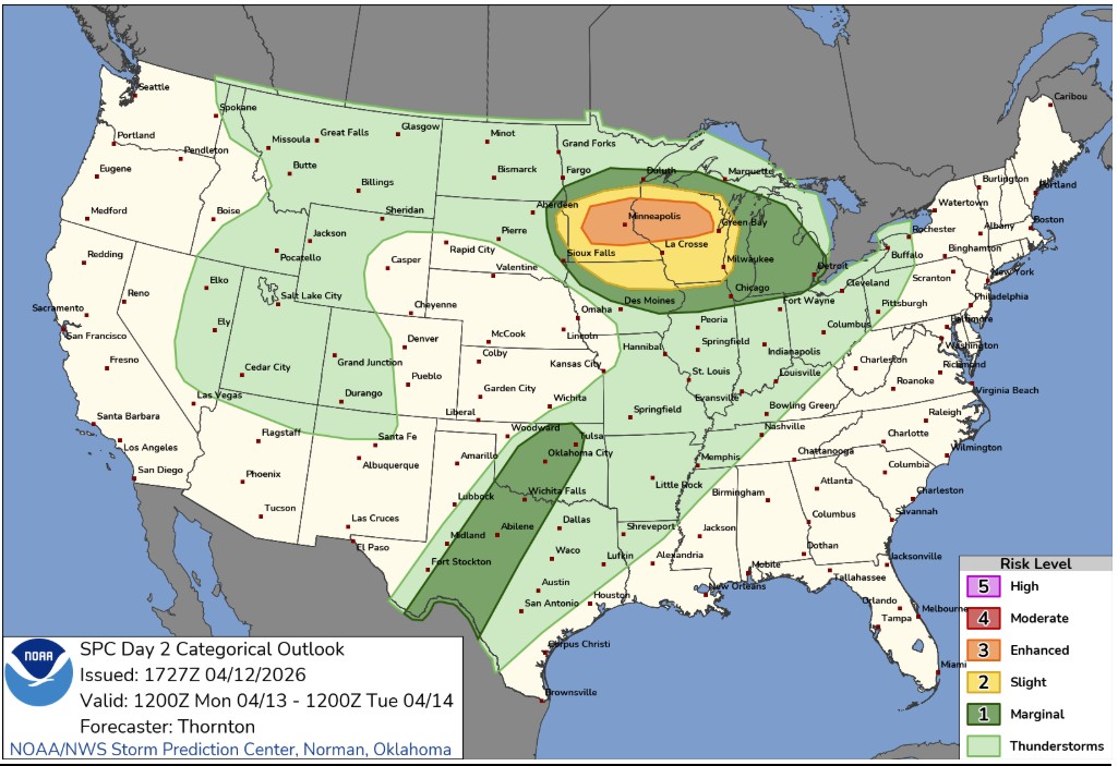 Para esta semana continuaremos con varios sistemas frontales que pasarán por el país, pero con mayor fuerza sobre el centro. El lunes existe un riesgo elevado de tormentas severas organizadas que podrán producir varios tornados fuertes y granizo grande en el este y sur de Minnesota y el oeste de Wisconsin, incluyendo ciudades pobladas como Minneapolis, St. Paul y sus cercanías. El mayor riesgo durante la tarde y la noche del lunes.