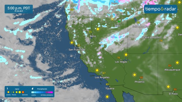 El Radar del Tiempo muestra un sistema que hoy se desplaza hacia el este a lo largo del oeste de EE. UU., lo que aumenta la probabilidad de lluvias y tormentas eléctricas a lo largo de la costa oeste y en algunas zonas de la Gran Cuenca. Se esperan las lluvias más intensas en la costa del norte y del centro de California, así como en las estribaciones de la Sierra Nevada, donde pueden producirse inundaciones aisladas, incluso en ciudades como San Francisco, Fresno y Sacramento.