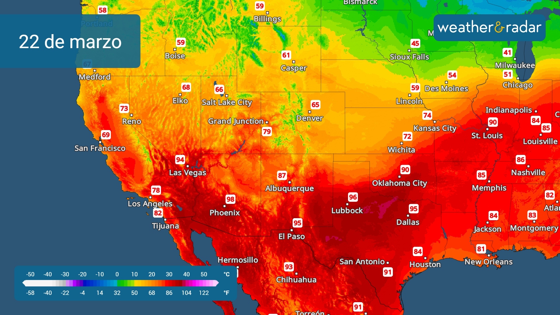 Las temperaturas máximas en los 80, 90 y hasta más de 100 grados se están extendiendo desde California hasta el valle medio del Misisipi hoy, con récords que datan desde 1877 en riesgo de ser superados.