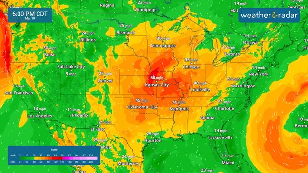 Los vientos, como se observa en nuestro Radar de Viento, serán extremadamente fuertes en los Ozarks después de que el frente frío pase por la periferia sur y oeste del sistema de baja presión. Las ráfagas desde Oklahoma hasta St. Louis y Des Moines podrían alcanzar al menos 50 mph. Estos vientos pueden transportar polvo, lo que puede obstruir la visibilidad para algunas personas. Con aire muy seco y ráfagas fuertes habrá un riesgo elevado de incendio en gran parte de Texas y condiciones críticamente altas desde la frontera con México hasta Midland.