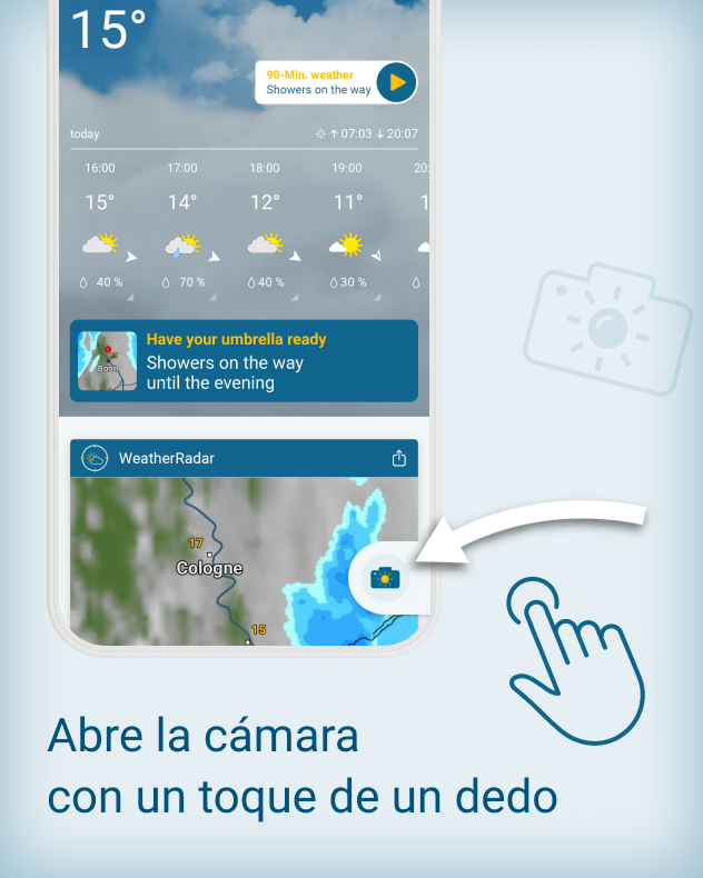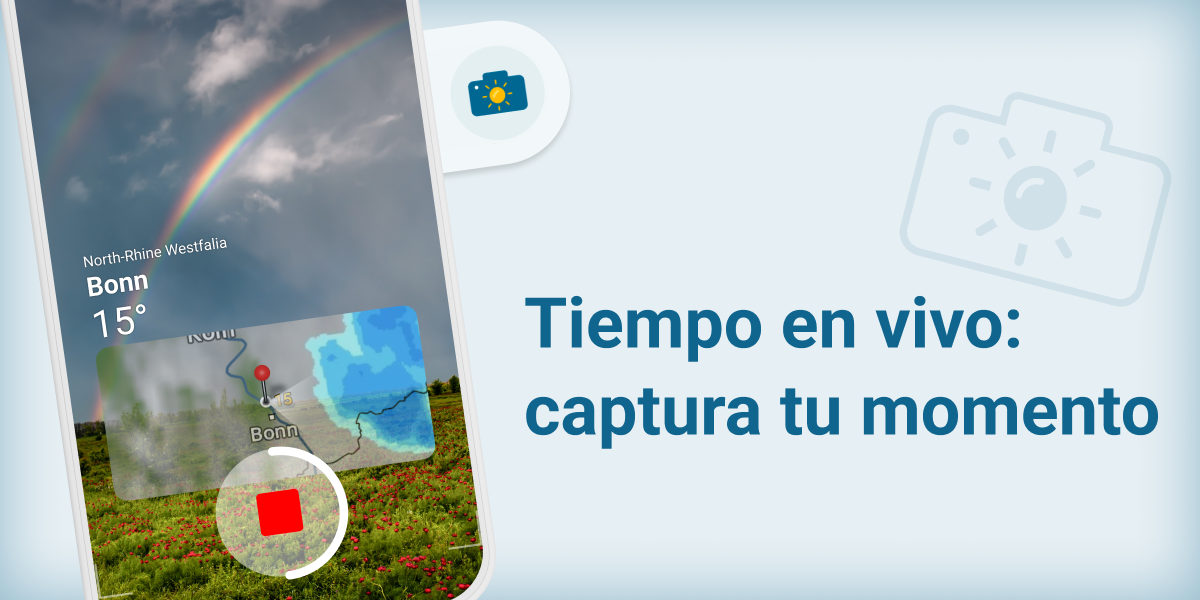 Con la nueva función de la app Weather & Radar en español, podrás guardar esos momentos para siempre: rápido, sencillo y directamente desde la app. El lugar, la hora y la información del tiempo se añade automáticamente, tú no tienes que hacer nada