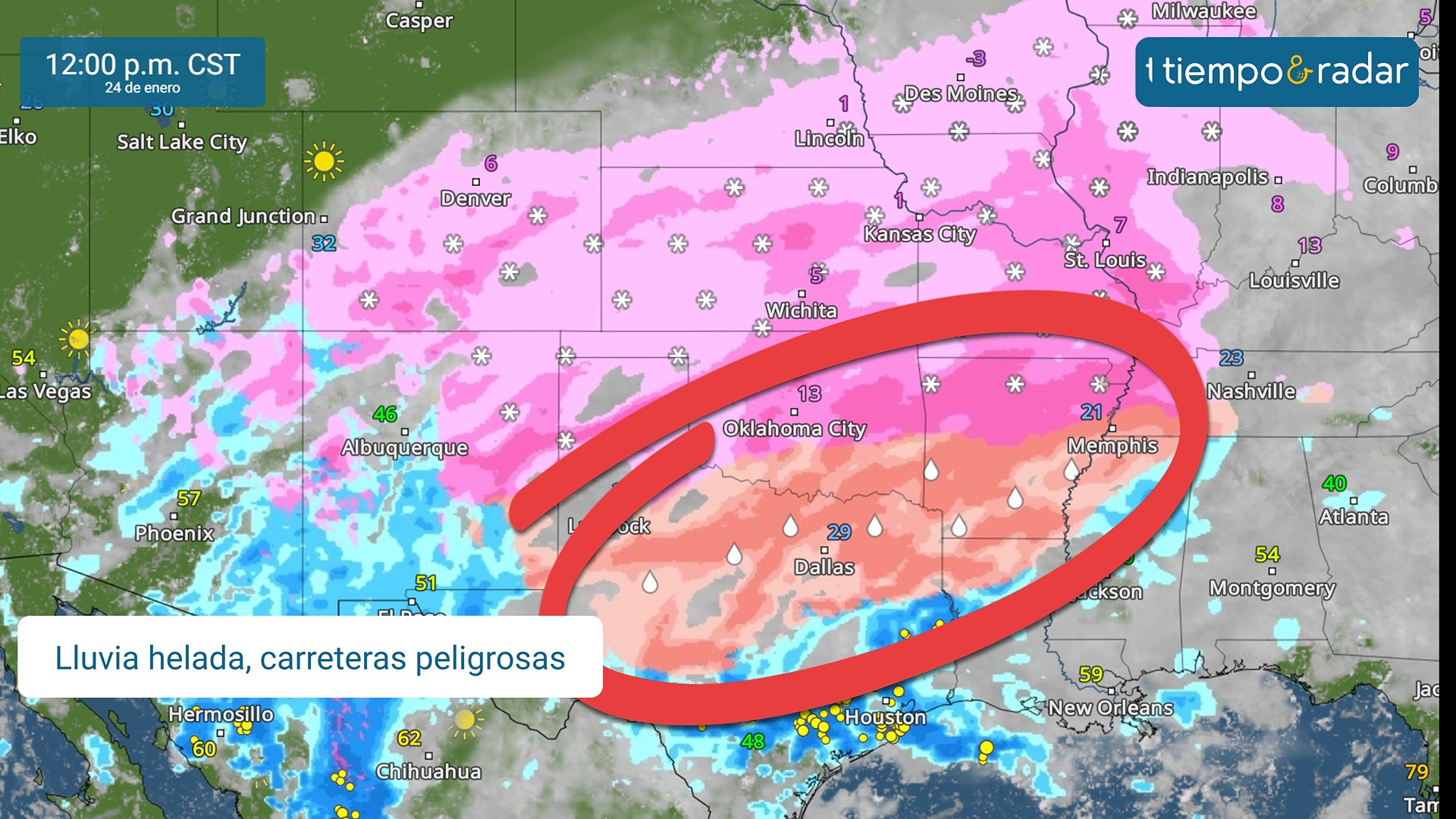 Las temperaturas extremadamente frías también interactuarán con una tormenta invernal que se está formando a última hora del viernes y se aleja del suroeste. El Radar del Tiempo muestra que es posible que haya nieve y hielo en el norte y el centro de Texas y Oklahoma, mientras que el sur de Texas se verá afectado por fuertes lluvias.